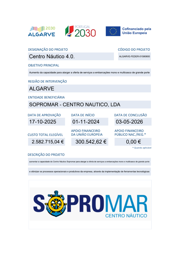 T AWe had our two Volvo Penta d2 -75 engines serviced at Sopromar in Lagos. From our first contact to paying the bill, the whole process was very professional, courteous and friendly. The technicians arrived at the boat exactly in time, prepared the working areas very carefully covering all possible places that can get oil/dirt etc. finished the job a bit earlier than initially predicted and to our surprise the overall bill, which we agreed initially, had been reduced noticeably due to a less-than-projected man hours. We have been extremely impressed by the management and the technical team and highly recommend them for any service or repairs. Thank you.Trustindex verifica se a fonte original da avaliação é Google. Nicolas CasanovaExcellent accueil et relation avec Pedro Pedras, tout au long de l’hivernage ! Très l’écoute et rendant compte de l’évolution des travaux avec régularité et précision. Il s’agit de l’un sinon du meilleur chantier dans lequel j’ai laissé mon voilier depuis 2017. Tous les corps de métier intéressant le maintien en condition des bateaux sont présents et professionnels, il y a toujours une solution. Comme le dit l’un des avis précédants, tout cela a un coût qu’il convient d’assumer. Excelente acolhimento e relacionamento com Pedro Pedras, durante todo o inverno! Muito atencioso e informando o andamento dos trabalhos com regularidade e precisão.Trustindex verifica se a fonte original da avaliação é Google. Ian HorneIn 40+ years of boat ownership, this is the best boatyard that I’ve found. There is almost no job that they can’t undertake and everything done for me has been to a high standard. No, they’re not the cheapest, but you get what you pay for. In particular, a big thanks to Uriel who has coordinated the work and been a pleasure to deal with and has kept me updated, with photos, throughout.Trustindex verifica se a fonte original da avaliação é Google. Peter SteinmannSopromar is a wonderful boatyard, Many very friendly and responsible employees have refurbished our yacht in a short time for our planned circumnavigation. They worked on our boat as if it were their own, to a very high standard and they also read all our wishes from our eyes so that we could set sail from Lagos with a perfectly equipped yacht. Many thanks to everyone involved! Peter SteinmannTrustindex verifica se a fonte original da avaliação é Google. Fredrik HagmanExcellent and professional service.Trustindex verifica se a fonte original da avaliação é Google. Dave PayneWe stopped here in June 2023 with ARC-Europe, and were immediately impressed with the chandlery and boat yard. After speaking with the manager, Daniel, he took to the time to explain their business and show us around the yard. They have all services available: welding, machine shop, HVAC, outboard service, electronics, fiberglass, painting...everything and everybody on site in bays that open to the boatyard. We chose to haulout there for 4 months and the prices were very reasonable. I had work priced and completed while in the marina, and the level of expertise is at the highest level. I had my AGM's replaced with Victron LiFePO4 batteries, and the installation was immaculate and exceeded my expectations. Once I was back aboard the installation team walked me through the tech and have been available to answer my numerous questions since. They have have been able to remotely log on to my system and make minor adjustments. We left on a stormy day and had to return after a faulty autopilot balked, Mr. Salgado facilitated an immediate repair (bad brushes) quickly and efficiently. Daniel Santos (chandlery manager) and Mr. Ricardo Salgado (boat yard service manager extraordinaire) are both knowledgeable, hardworking, thorough, friendly and very patient. The entire boatyard and chandlery workforce take pride in their work. The added bonus is that Lagos is a wonderful town.Trustindex verifica se a fonte original da avaliação é Google. Rémi GenonSuper cool shipyard with ALL the services and technicians you need (wood/platics/steel/inox workers, engine, riggings, sails ,etc…) Huge shop, the biggest I know between Belgium and Spain. Customer-oriented services. Ask for Uriel WilsonTrustindex verifica se a fonte original da avaliação é Google. Arne JanssonI have done a complete setup for worldsailing including Solar Panels, diesel generator, complete AC and heat, watermaker, SSB installation, Starlink Internet and much more. Very skilled and friendly technisians and staff. OneStopShop whatever you need for the boat. Arne Jansson SY Samsara Catamaran.Trustindex verifica se a fonte original da avaliação é Google. Ricardo SalgadoA Sopromar, estaleiro com uma localização de excelência, recomendo vivamente os seu serviços e loja nautica. Excelentes profissionais.Trustindex verifica se a fonte original da avaliação é Google.